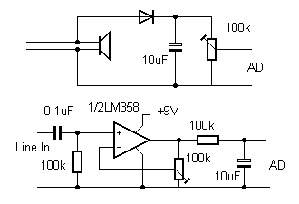 Es gibt mehrere mögliche Schaltungen. Die obere eignet sich für den Anschluss an einen Lautsprecher, die untere kommt mit kleineren Signalspannungen aus. Der OPV dient gleichzeitig als Verstärker und als Messgleichrichter.