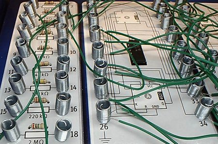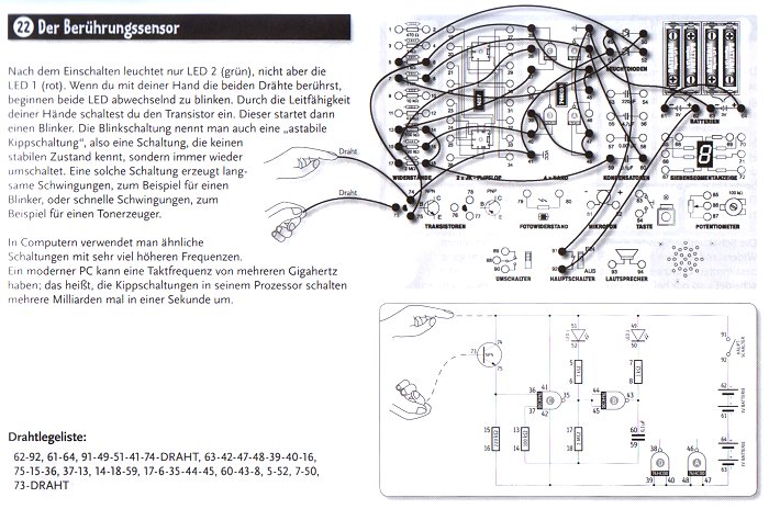 Das folgende Beispiel zeigt, wie die Versuche durchgeführt werden. Es gibt einen Schaltplan, einen Aufbauplan und eine Drahtlegeliste. Viele werden einfach der Liste folgen und die aufgelisteten Verbindungen herstellen. Man kann sich aber auch am Schaltplan oder am Aufbauplan orientieren. Der Text gibt jeweils einen sehr knappen Überblich zur Funktion und zum fachlichen Hintergrund der Schaltung. Lange Texte wurden vermieden, denn hier lernt man durch die Versuche selbst.