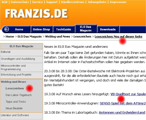 Alle Einträge in der Navigationsspalte sind gleichzeitig Links. Sie können also z.B. innerhalb der Hauptrubrik „Weblog und News“ die Unterrubriken „Das Labor-Tagebuch“, Tipps und Tricks“ oder „Neue Bauteile“ anklicken. Oder Sie klicken auf eine der anderen Hauptrubriken, z.B. auf „Grundlagen und Ausbildung“ oder auf „Literatur und Software“. Klicken Sie auf „Grundlagen und Ausbildung“. Nun öffnet sich diese Hauptrubrik und zeigt Ihnen die vorhandenen Unterrubriken.