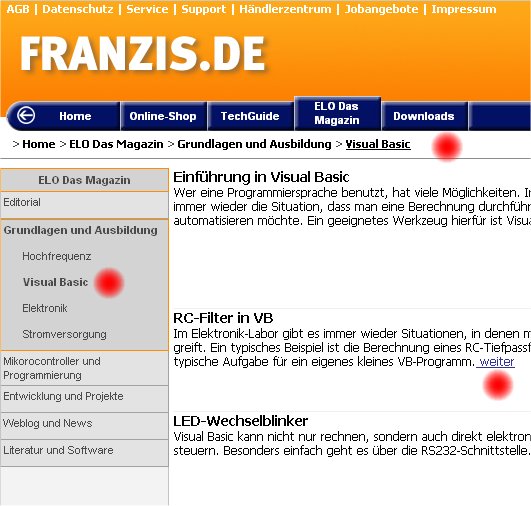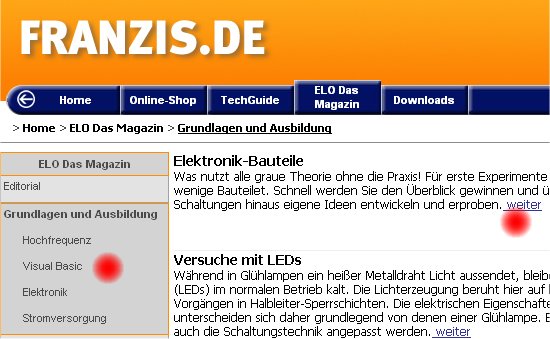 Die sichtbaren Kurzbeschreibungen zu den Artikeln „Elektronik-Bauteile“ und „Versuche mit LEDs“ führen zu ausgewählten Beiträgen, die Sie mit „weiter“ erreichen. Einen vollständigen Überblick erhalten Sie aber nur, wenn Sie eine Unterrubrik öffnen. Klicken sie z.B. auf „Visual Basic“. Damit öffnet sich diese Rubrik. In der Navigationsspalte und wird nun „Visual Basic“ in dicker Schrift angezeigt. Außerdem sehen Sie den genauen Ort auch oben: >Home>ELO Das Magazin>Grundlagen und Ausbildung>Visual Basic.