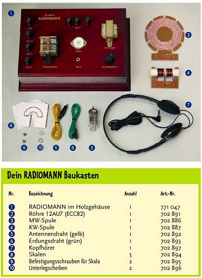 Der Radiomann ist ein vollständig verdrahtetes Radio. Man braucht nur noch die Röhre und eine Spule einzusetzen sowie Erde und Antenne anzuschließen. Mit entscheidend war die Überlegung, dass wohl nicht nur Kinder diesen Baukasten verwenden werden, sondern auch Erwachsene, die ihren ersten Radiomann schon vor vielen Jahrzehnten hatten. Da fanden wir es wichtig, dass man schnell zum Ziel kommt und nicht erst viel zusammenbauen muss.