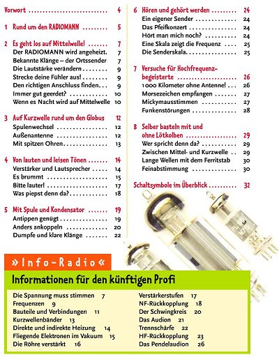 Das Handbuch beschreibt 30 Versuche, die dazu beitragen sollen, dass man in Sachen Radiotechnik so richtig durchblickt. Es geht ganz einfach los mit der richtigen Bedienung des Audions und vielen Tipps für den Radioempfang. Dann folgen Experimente, die helfen, die Funktion der Röhre zu verstehen. Die letzen Versuche werden anspruchsvoller, bis hin zu eigenen Spulen für weitere Frequenzbereiche und zum kompletten Umbau des Geräts für gespreizten Bandempfang. Hier kommt auch der Lötkolben zum Einsatz, was natürlich nur von erfahrenen Elektronikern verlangt werden kann.