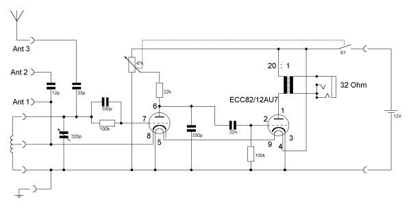 Für die Schaltung, die Versuchsbeschreibung und das Handbuch war ich verantwortlich. Spannend war die Auswahl der geeigneten Röhre. Sie sollte aus neuer Produktion stammen und mit kleiner Anodensapannung auskommen. Die Wahl fiel auf die ECC82, die mit 12 V Heiz- und Anodenspannung betrieben wird. Bei einem Heizstrom von 150 mA ereicht man eine gute Lebensdauer der Batterien. Bei der Schaltung handelt es sich um einen 0V1, also einen Empfänger mit einer Audionstufe und eine NF-Stufe. Es gibt zwei Spulen, die wahlweise eingesetzt werden, eine Flachspule für Mittelwelle und eine Zylinderspule für Kurzwelle.