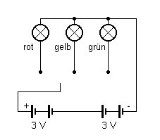 Damit es noch schwerer wird, kannst du auch mehr als drei Leitungen verwenden. Schließe zum Beispiel an die gelbe und an die rote Lampe jeweils zwei Drähte an.