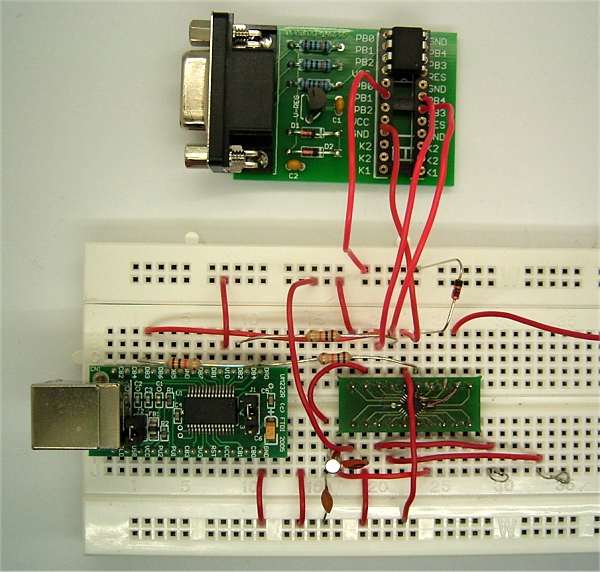Im ersten Test habe ich den ursprünglichen Aufbau mit USB-Adapter verwendet und den kleinen Controller auf der Platine des Lernpakets Mikrocontroller parallel angeschlossen. SDA geht an Port B.4, SCL an Port B.3. Zusätzlich ist noch der Reset-Pin über eine Diode an Port B.1 angeschlossen. Beim Neuprogrammieren des Tiny13 muss man die Verbindung zu Reset lösen, weil über den zusätzlichen kleinen Strom der Reset des Tiny nicht richtig ausgeführt wird.  Die Stromversorgung für das Radio kommt vom USB, die für den Controller über die RS232. Man kann das Radio wahlweise über den PC mit VB oder über den Mikrocontroller steuern, beide Programme dürfen sogar gleichzeitig aktiv bleiben.