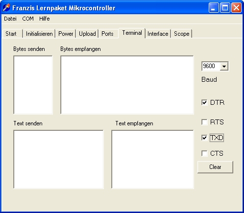 Die Software verwendet nur zwei Grundfunktion des Chips: Initialisierung für UKW und Abstimmung auf eine Frequenz. Eine fest programmierte Frequenzliste wird mit einer Taste an B.2 durchgeschaltet. Damit hat man nur gültige, gut empfangbare Kanäle. Zur Entwicklungszeit kann man die Taste über das Terminal der Programmiersoftware simulieren. Man klickt einfach TXD an und schaltet die Leitung wieder aus.