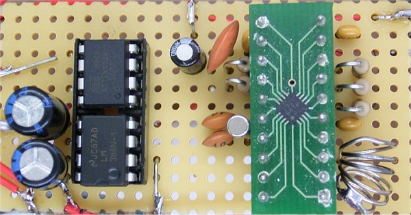 Das Radio wird mit einer Li-Zelle mit 3,7 V betrieben. Die Spannung an Vio soll nicht über 3,6 V liegen. Deshalb wurde eine Si-Diode eingefügt, die die Betriebsspannung um ca. 0,6 V reduziert. Das Radio enthält einen kleinen Audioverstärker LM386. Die Stereosignale werden zusammengeführt und durchlaufen einen Tiefpass zur Anpassung der Klangeigenschaften des relativ kleinen Lautsprechers.