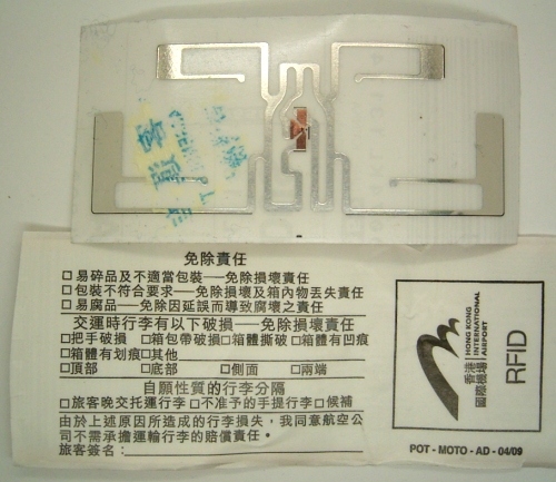 Wenn einer eine Reise tut, dann kann er oft was mitbringen. An meinen Koffer fand ich einen RFID-Transponder in Form einer Klebeband-Schleife. Die Antennenform verrät, dies ist kein 13,56-MHz-Transponder, es ist ein Dipol für vermutlich 870 MHz. Diese Bauform ist mir bisher noch niemals begegnet. Aber es scheint gut zu funktionieren, denn der Koffer kam genau am richtigen Zielflughafen an.