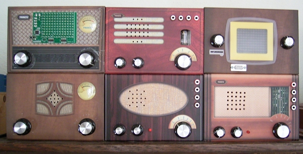Ab und zu muss man mal aufräumen. Deshalb habe ich einige meiner Retro-Radios und Musteraufbauten auf dem Schrank gestapelt. Jetzt wirkt das alles wie ein großes Gerät, eine Schiffsfunkanlage oder sowas. Die vielen unterschiedlich großen Knöpfe, die Skalen, Messgeräte und zwei Bildschirme, das sieht nach Hochtechnologie vergangener Tage aus, obwohl es doch nur einfache Bausätze sind. Das Gerät oben links war eigentlich ein Mittelwellenradio, ich habe es aber als Prototyp für die Entwicklung des Franzis/Conrad-Pingpong verwendet. Im Moment läuft darauf das Bascom-Testprogramm einer fortlaufenden Sinuswelle. Das ist jetzt sozusagen mein Oszilloskop oder vielleicht auch das Panoramaspektrum der Schiffsfunkanlage. Alle diese Bausätze sind in ELO genauer beschrieben. Und es gibt dort immer wieder Leserbeiträge zu umgebauten Radios oder Pingpong-Bausätzen. Das Conrad-Pingpong oben rechts ist mit einer DB9-Buchse ausgestattet, über die eigene Software eingespielt werden kann.