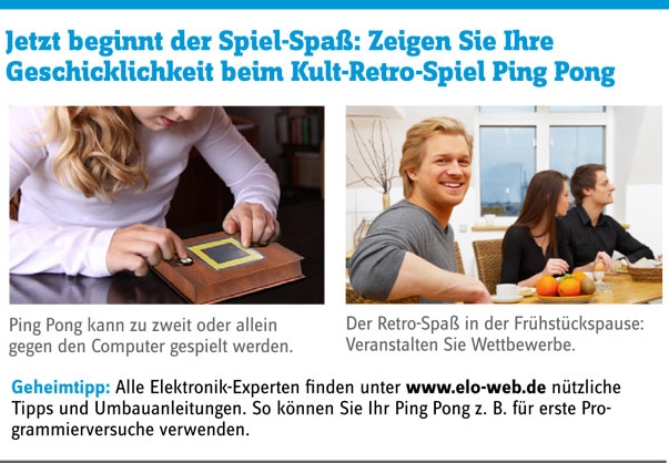 Im Moment ist ja Weihnachtsgeschenkeendspurt. Da habe ich mich gefreut, dass das Conrad-Pingpong sogar beim ZDF-WISO erwähnt wurde, als einer von mehreren Vorschlägen gegen langweilige Weichnachtsgeschenke (Sendung vom 14.12.09, Minute 29). Und auch im Computer-Club 2 wurde es vorgestellt.Bei Conrad gab es einen Newsletter zum Pingpong-Bausatz: