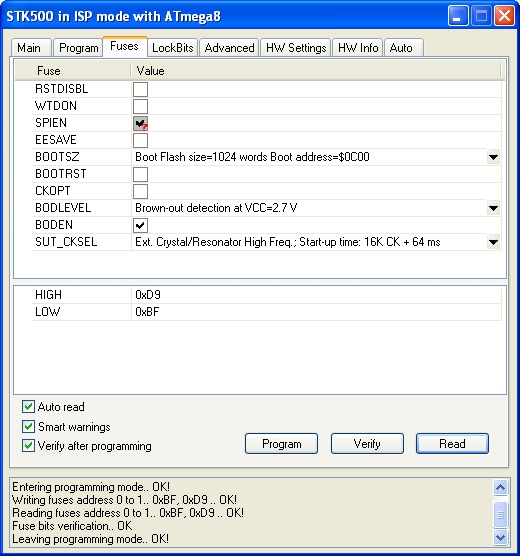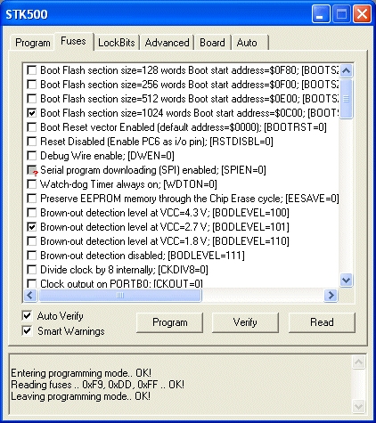 Manchmal entwickle ich AVR-Firmware für Mess- und Steuergeräte einer befreundeten Firma. Die Hardware sehe ich meist gar nicht, alles geht per Email und Telefon. Ich entwickle meist auf dem STK500, vor Ort wird es dann in der Zielhardware getestet. Natürlich funktioniert nicht immer alles sofort. Dann kommt regelmäßig die Frage auf: Liegt es an der Software, oder liegt es an der Hardware. Aber jetzt ist ein Fall aufgetreten, da lag das Problem genau dazwischen: In den Fuses!
