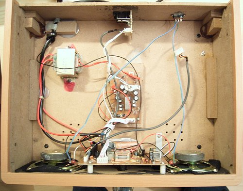 Das Projekt stieß zunächst auf Probleme. Die internen Lautsprecher des sehr einfachen Plattenspielers hatten einen extrem schlechten Klang und liefen immer mit. Da musste ich zum Lötkoben greifen. Jetzt sind die internen Lautsprecher abschaltbar. Das Bild zeigt auch, dass die originale Anlage keinen brauchbaren Klang haben konnte. Es war eben ein sehr einfaches Gerät, das bisher nur dazu diente, mal in die vorhanden Platten reinzuhören.