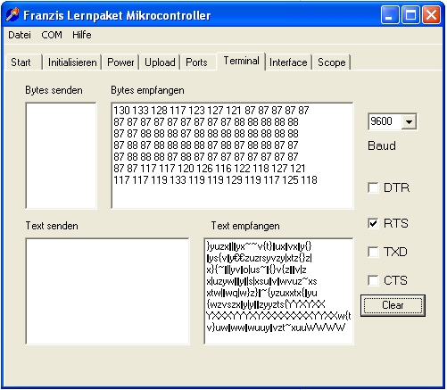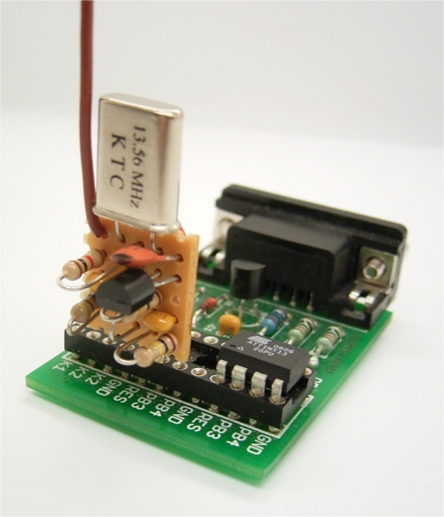 Das Programm stoppt den Oszillator jeweils für 200 ms und schaltet dann PB3 in den hochohmigen Zustand. Ab dann wird im Abstand von 10 µs immer wieder nachgeschaut ob die Schwellspannung des Eingangs von ca. 2,5 V schon erreicht wurde. Sobald der Oszillator angeschwungen ist wird er wieder abgeschaltet. Die Variable T enthält dann die Anschwingzeit in Einheiten von 10 µs zur Ausgabe. Am Port PB0 erscheint ein PWM-Signal. Hier kann direkt ein analoges Messgerät mit einem Messbereich von 2,5 V angeschlossen werden. Der Zeigerausschlag geht mit wachsender Feldstärke zurück. Gleichzeitig wird über PB1 ein serielles Signal mit 9600 Baud gesendet. An einem Terminal kann die Feldstärke gelesen werden.