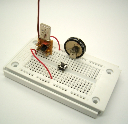 Eines der beiden Pendler-Module wird in einem Handsender benutzt. Als Stromversorgung dient ein Goldcap-Kondensator mit 1 F und 5,5 V. Das zweite Modul wird auf die Experimentierplatine mit ATtiny13 aus dem Lernpaket Mikrocontroller aufgesetzt. Der Anschluss D wird mit dem Port PB3 verbunden.