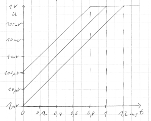 Der Pendeloszillator verstärkt ein Eingangssignal mit dem Anschwingen des Oszillators. Beginnt man z.B. mit einer Eingangsspannung von 1 µV, dann schaukelt sich diese HF-Spannung in einer Zeit von 1,2 ms bis auf ca. 1 V auf. Das entspricht einer Verstärkung von 120 dB mit nur einem Transistor! Bei einem zehnfach größeren Eingangssignal von 10 µV braucht der Oszillator nur 1,0 ms um die Endspannung zu erreichen, bei 100 µV sind es nur 0,8 ms. Das Ausgangssignal stellt also ein logarithmisches Maß für die Eingangsspannung dar. Ganz grob kann man von 100 dB/ms ausgehen.