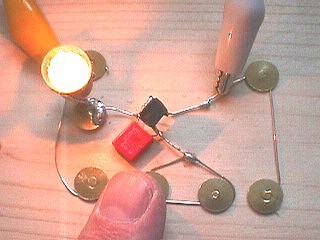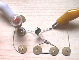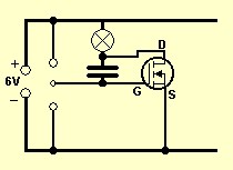 Der FET kann wie ein Transistor eine Lampe einschalten. Das besondere ist, dass das Gate wie ein Kondensator isoliert. Einmal aufgeladen auf ca. 5 V leitet der FET. In der Schaltung unten braucht man nur die beiden linken Kontakte berühren, dann ist die Lampe an. Mit den rechten geht sie wieder aus.