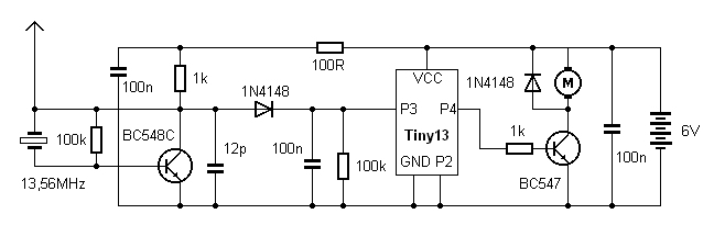 Der Tiny13 wurde mit dem Lernpaket Mikrocontroller programmiert. Weil der Bootloader mit drin ist darf man nicht vergessen, P2 an GND zu legen. P4 ist der Schaltausgang. Ein Transistor reicht um den Motor zu schalten. Hier die Empfängersoftware in Bascom: