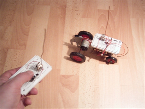 Der Schleicher wurde bisher nur mit Licht gesteuert. Aber jetzt bekommt er eine Funkfernsteuerung! Der Quarz-Pendler macht´s möglich. Da der Schleicher keine Lenkung besitzt wird nur ein Kanal benötigt. Der Fernsteuersender braucht dann nur eine Taste. Die Bedienung ist ganz simpel: Kurz drücken = AUS, lang drücken = AN.