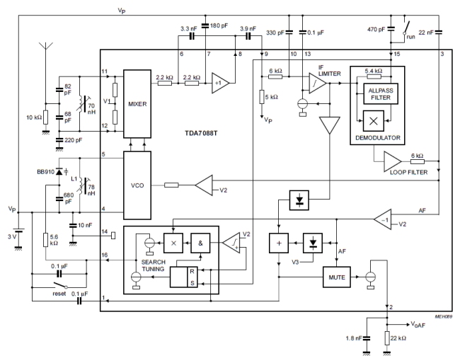 TDA7088T. Man stimmt die Frequenz mit zwei Tasten ab. Reset setzt den