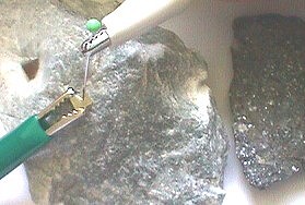 Allgemein ist Bleiglanz niederohmiger als Pyrit. Es passt wohl besser zu der relativ niederohmigen Messschaltung. Allerdings musste ich da noch länger nach einer geeigneten Stelle suchen.
