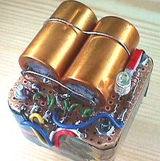 Eine Zusatzschaltung sorgt für eine Energiespeicherung. Zwei Vierweggleichrichter mit je 4 Dioden 1N4148 laden einen Elko mit ca. 4700 µF auf (Im Beispiel wurde 2 * 2200µF parallel verwendet). Die super-helle LED wird umschaltbar über einen Vorwiderstand von 390 Ohm (sehr hell) oder 22 K (lange Speicherzeit) betrieben. Der Anwender muss sich beim Drehen etwas beherrschen: In Schalterstellung "hell" kann der zulässige Maximalstrom von 20 mA überschritten werden, in Stellung "lang" überschreitet man leicht die zulässige Spannung der Elkos von z.B. 16 V.