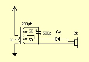 Die gewünschte Selektion erreicht man durch einen Schwingkreis aus Spule und Drehkondensator. Mit einem Drehkondensator von 500 pF und einer Spule mit 200 µH überstreicht man den ganzen Mittelwellenbereich. Die Spule kann als Luftspule mit 100 Windungen auf eine Papprolle mit einem Durchmesser von 4 cm aufgewickelt werden. In dieser Schaltung funktioniert übrigens auch ein Kristall-Ohrhörer sehr gut. Bei den Schaltungen ohne Spule geht er nicht.