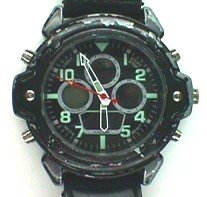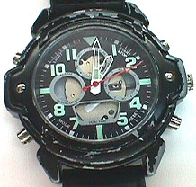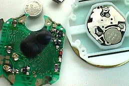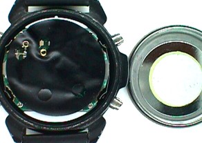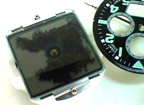 Die Uhr war irgendwie doppelt gebaut: mit Zeigern und mit einer digitalen Anzeige, die man durch vier Löcher im Ziffernblatt sehen konnte. Ich habe mich immer gefragt, wie das gehen kann. Dass man eine LC-Anzeige mit Loch bauen kann, hätte ich nie für möglich gehalten. Aber so wie es aussieht, war dies auch der Schwachpunkt, an dem das Glas gebrochen ist. Wenn einmal Luft eindringt, wird jedes LCD schwarz.