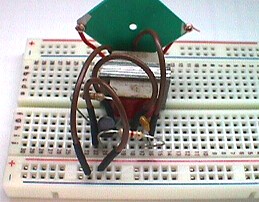Der Trafo hat drei getrennte Wicklungen. Mit dem Multimeter wurde zuerst ihr Widerstand gemessen. Sie hatten 60 Ohm, 60 Ohm und 180 Ohm. Damit war klar, welche wenig Windungen und welche viele hatte. Nun kommt es aber auch auf die Wickelrichtiung bzw. auf die Anschlussfolge an. In einem zweiten Test wurde eine Wechselspannung von 50Hz/3V an die hochohmige Wicklung gelegt. Die anderen beiden wurden in Reihe geschaltet und so lange umgepolt, bis die größte Spannung gemessen werden konnte. Alle Spulen zusammen hatten nun etwa 6 V, eine der kleineren allein etwa 1,5 V. Damit war klar, der Trafo hat ein Windungsverhältnis von 1:1:2. Also damit lässt sich ein Spannungswandler bauen. Mit etwas Probieren kam die folgende Schaltung heraus.