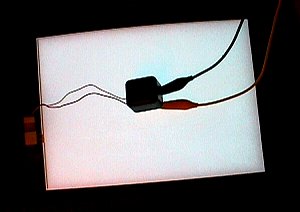 Aber leider nur kurz, dann ist sie kaputtgegangen. Ich weiß nicht einmal, ob ich sie elektrisch überlastet habe, oder ob sie durch die selbstgebauten Kontakte zu stark gebogen wurde. Vielleicht wollte diese Folie weniger Spannung und eine höhere Frequenz sehen. Jetzt jedenfalls leuchtet sie nur noch an einem ganz schmalen Streifen. Es sieht aus wie ein Riss zwischen dem Anschluss und der dünnen Flächenelektrode. Schade, schade, schade.
