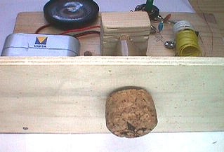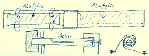 Man nehme zwei Streifen breites Paketklebeband und klebe zwei etwas schmalere Streifen Alufolue darauf. Der Rand des Klebebandes wird so umgeknickt, dass keine klebende Stelle mehr offen bleibt. Beide Streifen klebt man so aneinander, dass die Alufolie links oben und rechts unten ist. Die Mitte ohne Alufolie schiebt man in eine Holzstange, die mit der Laubsäge eingeschlitzt wurde. Dann wird alles in einem Holzgestell eingebaut, wie es die Fotos zeigen. Eine Schraube von hinten verhindert, dass die Achse herausrutschen kann. Vorn wird ein angebohrter Sektkorken aufgeleimt.