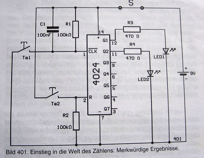 Digitalzähler sind fürchterlich teuer, Taschenrechner sind spottbillg. Dabei ist fast das selbe drin. Steve Markgraf (11 Jahre) hat mir seinen Zähler beschrieben: Er tippt folgendes ein: "1", "+", "=", "=", "=", "=" usw. Die meisten Taschenrechner arbeiten so als Zähler. Jetzt muss man nur noch die Gleich-Taste anzapfen, und fertig ist der Digitalzähler.