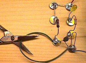 Noch eine kleine Änderung, dann wird aus der Schaltung eine Alarmanlage. Eine Drahtschleife sichert z.B. eine Tür. Wenn jemand die Tür öffnet, wird der Draht zertrennt, und die LED leuchtet. Der Alarm geht auch los, wenn einer ganz schlau sein möchte und den Draht zerschneidet.