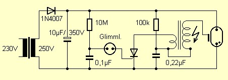 Die Schaltung ist ganz klar. Die Diode lädt den Elko. Eine Spannung von über 300 V liegt dann an der Blitzröhre. Relativ langsam lädt sich der kleine Kondensator mit 0,1 µF auf, bis die Glimmlampe bei ca. 100 V zündet. Damit wird auch der Thyristor gezündet. Er entlädt den zu dieser Zeit bereits fast vollen Kondensator mit 0,22 µF über den Zündtrafo. An der Sekundärseite des Trafos entsteht eine Spannung von 5 bis 10 kV. Dieser Spannungsimpuls zündet dann auch die Blitzröhre. Nun sind alle Kondensatoren leer. Aber schon nach einer halben Sekunde geht es wieder los und der nächste Blîtz entsteht.