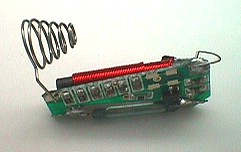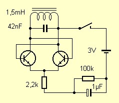 Statt einer Ferritantenne wurde eine kleine Festinduktivität mit 1,5 mH benutzt. Die Schaltung ist so ähnlich wie die in der 100-Sekunden-Uhr. Der Schwingkreiskondensator besteht in der Realität aus zwei keramischen Kondensatoren mit je 22 nF. 1,5 mH und 42 nF ergeben eine Resonanzfrequenz von 20 kHz. Auf einen genauen Abgleich wurde verzichtet. Ein Elko von 1 µF sorgt für eine Sendedauer von ca. 2 ms, denn 0,000001 Farad mal 2000 Ohm ergibt eine Zeitkonstante von 0,002 Sekunden. Und statt des Reedkontakts gibt es einen kleinen Taster.