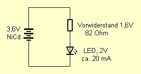 Eine LED soll immer mit einem Vorwiderstand angeschlossen werden. Er verhindert eine Überlastung und garantiert eine relativ gleichbleibende Helligkeit bei abnehmender Batteriespannung. Aus den Daten der LED ist die Diodenspannung bekannt, z.B. Uf = 2 V für eine superhelle, rote LED. Die Batteriespannung sollte etwas höher liegen. Am Vorwiderstand gibt es dann einen Spannungsabfall von 3,6 V - 2 V=1,6 V. Die LED soll z.B. mit einem Strom von 20 mA betrieben werden. Dann berechnet man den Widerstand nach dem Ohmschen Gesetz mit 1,6 V / 0,02 A = 80 Ohm. Da man genau 80 Ohm nicht bekommt, nimmt man 82 Ohm (Farben: grau, rot, schwarz). Es darf ein ganz kleiner Widerstand sein, weil die Belastung mit 1,6 V * 20 mA = 32 mW sehr gering ist. Typisch sind z.B. Widerstände mit 1/8 W.