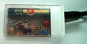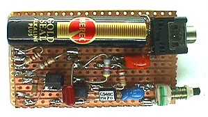 Hier wurde ein kleiner Schwingkreis für Kurzwelle gleich auf die Platine gelötet. Die Abstimmung erfolgt nicht mt einem Drehko, sondern mit dem Ferritkern der Spule, was viel Platz spart. Die ganze Schaltung wurde auf die Lötseite einer Streifenraster-Platine gebaut. Als Gehäuse dient jetzt eine Tic-Tac-Dose. Als Antenne reicht ein kurzes Stück Draht. Besonders am Abend lassen sich viele ferne Stationen hören.