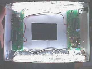 Die Platine hat einen Stecker für ein Flachbandkabel. Da kann man zwei Drähte und eine Netzteilbuchse anschließen. Die Leitung 4 kommt direkt an Masse, denn auf der Platine gibt es ja noch R3. Als Netzteil reicht ein ganz normales Steckernetzteil 12V/500mA/unstabilisiert. Die Lampe braucht nur 100 mA. Die Leistung beträgt also nur ca. 1 Watt, aber trotzdem liefert die Röhre ein wunderbar weißes Licht. Und wenn man dann auch noch zwei davon hat, taucht wieder die Frage auf: Und was macht man nun damit? Na klar, man baut sich eine Beleuchtungseinrichtung für die Digitalkamera! Ein Pappdeckel, ein Loch zum durchknipsen, zwei Reflektoren aus Alufolie, eine gemeinsame Netzteilbuchse, alles mit Tesafilm festgemacht, fertig.