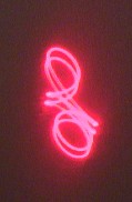 Der Laserpointer wird auf den Ablenkspiegel gerichtet. Die beiden Spulen schließt man an geeignete Signalquellen an. Im ersten Versuch wurde eine Spule über einen Vorwiderstand an einen Netztrafo gelegt, der Ablenkstrom betrug etwa 50 mA. Die andere Spule war an einen Sinus-Signalgenerator angeschlossen.