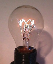 Die Lampe mit Wolfram-Glühfaden ist etwas kleiner und wesentlich heller als die Kohlefadenlampe. Wenn man den Fadenwiderstand im kalten Zustand misst, stellt man folgendes fest: Kohlefaden: 1280 Ohm, Wolframfaden: 92 Ohm. Beide Lampen waren ausgelegt für 220 Volt und 60 Watt. Der Nennstrom war also für beide 0,27 Ampere, der Arbeitswiderstand 810 Ohm. Also der Kohlefaden wird im heißen Zustand niederohmiger, der Metallfaden hochohmiger. Faustregel: Der Kaltwiderstand beträgt bei Wolframlampen 1/10 des Heißwiderstands.