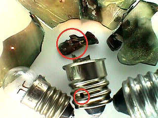 Glühlampen können beim Durchbrennen einen Lichtbogen entwickeln und einen Kurzschluss auslösen. Aber bisher hätten wir nicht geglaubt, dass sie dabei auch explodieren können. Genau dieses ist bei einer kleinen Glühlampe aus einer Weihnachtsbeleuchtung passiert. Das Glas ist völlig zersplittert, und stark mit Kupfer bedampft. In den Schraubsockel ist ein Loch gebrannt. Die Lampe hatte übrigens eine Sockelgröße zwischen E10 und E14. Sie stammt wohl aus einem fernen Land, wo es keinen VDE gibt. Oder Dietrich Drahtlos hat bei der Entwicklung mitgewirkt.