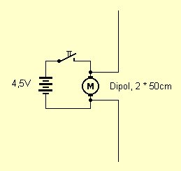 Und nun soll auch noch der zugehörige Sender gebaut werden. Am einfachsten geht es mit einem kleinen Gleichstrommotor. Der stört sowieso immer. Man braucht nur eine Antenne anzuschließen. Es muss kein Dipol sein, ein einzelner Draht geht auch. Die Antennen am Sender und am Empfänger sollen gleich lang sein. Beide waren beim Prototyp 50 cm lang. Die Wellenlänge war also 2 m (Die Funkamateure im 2-Meter-Band mögen mir verzeihen), die Frequenz etwa 150 MHz.