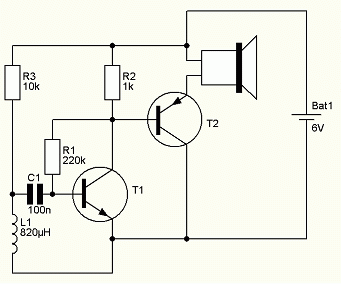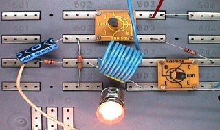 Der Sender arbeitet mit einer Spule. Die Spule im Empfänger ist an einen Verstärker angeschlossen. Der Empfänger funktioniert bis ca. 5 m Entfernung. Wenn man den Taster am Sender drückt, knackt es im Lautsprecher des Empfängers.