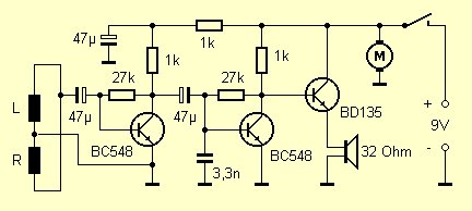 Der Verstärker kommt mit 3 Transistoren aus. Es handelt sich um einen Hi-End, Superpower, Klasse-A-Typ mit geringsten Verzerrungen. Die Lautstärke ist gerade richtig, deshalb kann man auf einen Regler verzichten.