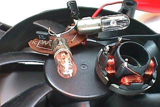 Wenn mal wieder ein PC-Lüfter kaputt geht, sollte man ihn nicht gleich wegwerfen, sondern erst mal reinschauen. Dieser hier enthielt nur ein IC (Aufdruck: 276 012F) mit vier Beinchen. Plus, Minus und zwei Ausgänge für die Motorspulen, mehr braucht man anscheinend nicht. Und das Besondere ist, die Ausgänge schalten je nach Polarität eines äußeren Magnetfelds um.