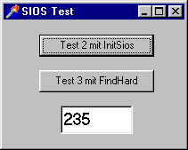 In einem dritten Schritt soll die allgemeine Initialisierung mit FINDHARD erprobt werden. Mit einem Übergabeparameter "1" zeigt die Funktion das gefundene Interface und die verwendete Schnittstelle in einer Messagebox an. Das Programm funktioniert ohne Änderung für das CompuLAB, die MiniRS-Box, das SIOS und die ZELLE. Hier soll laufend ein Meßwert des ersten analogen Eingangskanals in einem Textfenster angezeigt werden. Die Messung und Ausgabe erfolgt daher in einer Timer-Prozedur.