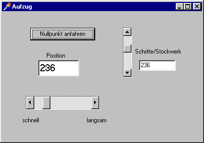 Hier soll ein Schrittmoor in einem älteren Aufzug-Modell gesteuert werden. Modul-Bus hat zwei Varianten eines Aufzugs gebaut. Die meisten der noch in den Schulen vorhandenen Aufzugsmodelle dürften mit dem hier vorgestellten Programm korrekt arbeiten.