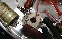 Für die weitere Entwicklung liehen wir uns einen alten Oszillographen und einen Sinusgenerator. Der Verstärker bekam einen Lastwiderstand von 6,8 Ohm am Ausgang. Dort konnte man dann die Ausgangsspannung messen. Dann wurde dies und das ausprobiert. Zuerst schalteten wird jeweils 2,7 kOhm parallel zu den alten Kathodenwiderständen. Damit steigt schon mal der Anodenstrom der Röhren. Da das noch nicht reichte, wurde noch jeweils ein Elko mit 47 Mikrofarad parallel gelegt. Das Ergebnis: Wesentlich mehr Verstärkung und Ausgangsleistung. Und weil es so gut lief, wurden gleich noch die Widerstände an den Schirmgittern verkleinert, 390 Ohm für die PL504 und 68 Ohm für die PL36. Ergebnis: Noch mehr Power.