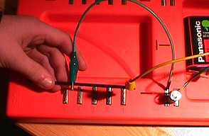 Eine Bleistiftmine besteht aus Graphit und hat mehr Widerstand als ein Draht. Man damit erreichen, dass eine Lampe weniger hell leuchtet. Eine Krokodilklemme wird auf der Mine verschoben. Je länger der Abschnitt im Stromkreis ist, desto schwächer leuchtet die Lampe.