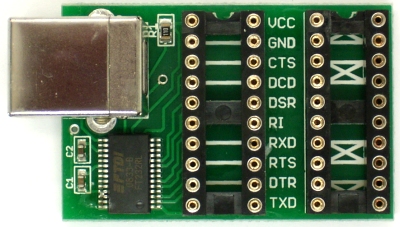 Grundlage des Lernpakets ist eine kleine Experimentierplatine mit dem USB/Seriell-Wandler FT232R. Sie erhalten damit die Anschlüsse einer seriellen Schnittstelle, allerdings mit etwas anderen Daten, nämlich mit TTL-Pegeln von 0V/5V statt der früher üblichen RS232-Pegel von ca. -12V/+12V. Zusätzlich liefert der USB auch eine Spannungsversorgung von +5 V, die Sie bis ca. 50 mA belasten können. Alle Anschlüsse sind über zweifache Präzisionskontakte erreichbar, in die direkt elektronische Bauteile gesteckt werden können. Zusätzlich besitzt die Platine ein kleines Experimentierfeld mit fünf Gruppen von je vier verbundenen Kontakten.