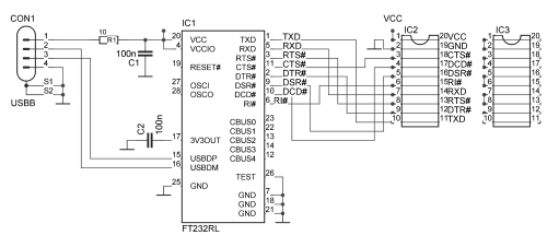 Der FT232R setzt die USB-Signale mit geringster externer Beschaltung in eine serielle Schnittstelle um. Damit hat man die serielle Sendeleitung TXD, die serielle Empfangsleitung RXD und die üblichen Handshake-Leitungen, darunter zwei Ausgänge und vier Eingänge. Die Software verwendet alle Leitungen wie eine normale serielle Schnittstelle. Dadurch werden nur sehr einfache Befehle benötigt. DTR 1 schaltet z. B. die Leitung DRT ein. Dass dabei im Hintergrund viele Softwareschichten durchlaufen werden, muss man weder wissen noch beachten, wenn es um die eigentlichen Anwendungen geht. Wer sich genauer mit der Software beschäftigen und die zahlreichen erweiterten Möglichkeiten des Chips nutzen will, dem sei das Buch „USB in der Elektronik“ [1] empfohlen.